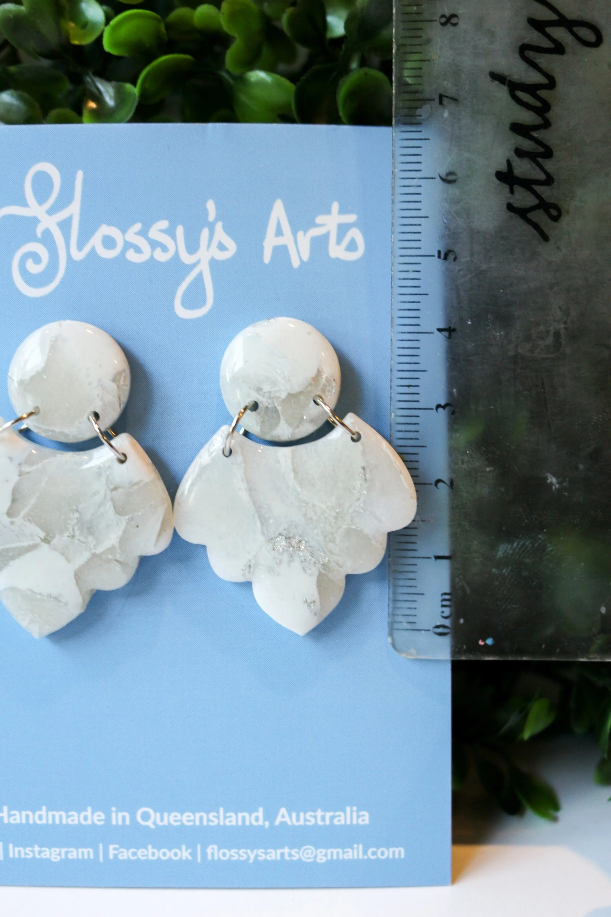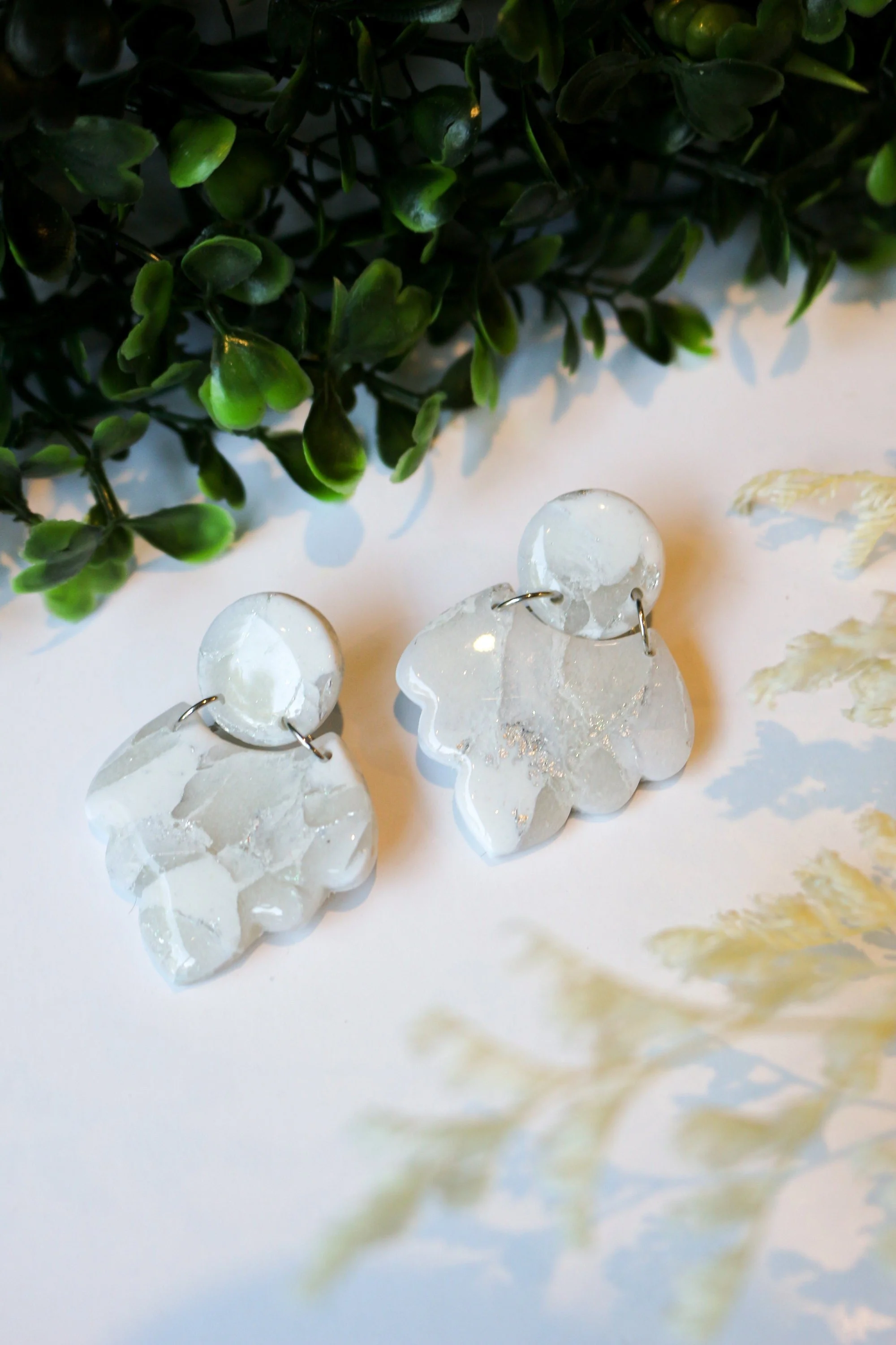 These beautiful, one of a kind statement earrings are handmade from polymer clay and boast a complex marble pattern of various shades of white, translucent effect and silver leaf. A resin coating gives them an extra shine.